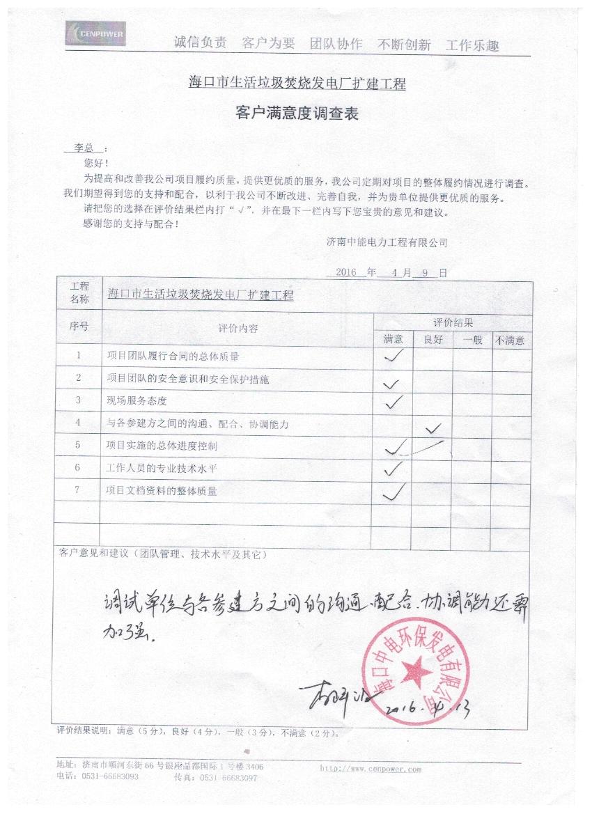 中机电力、中电投公司反馈客户满意度调查表