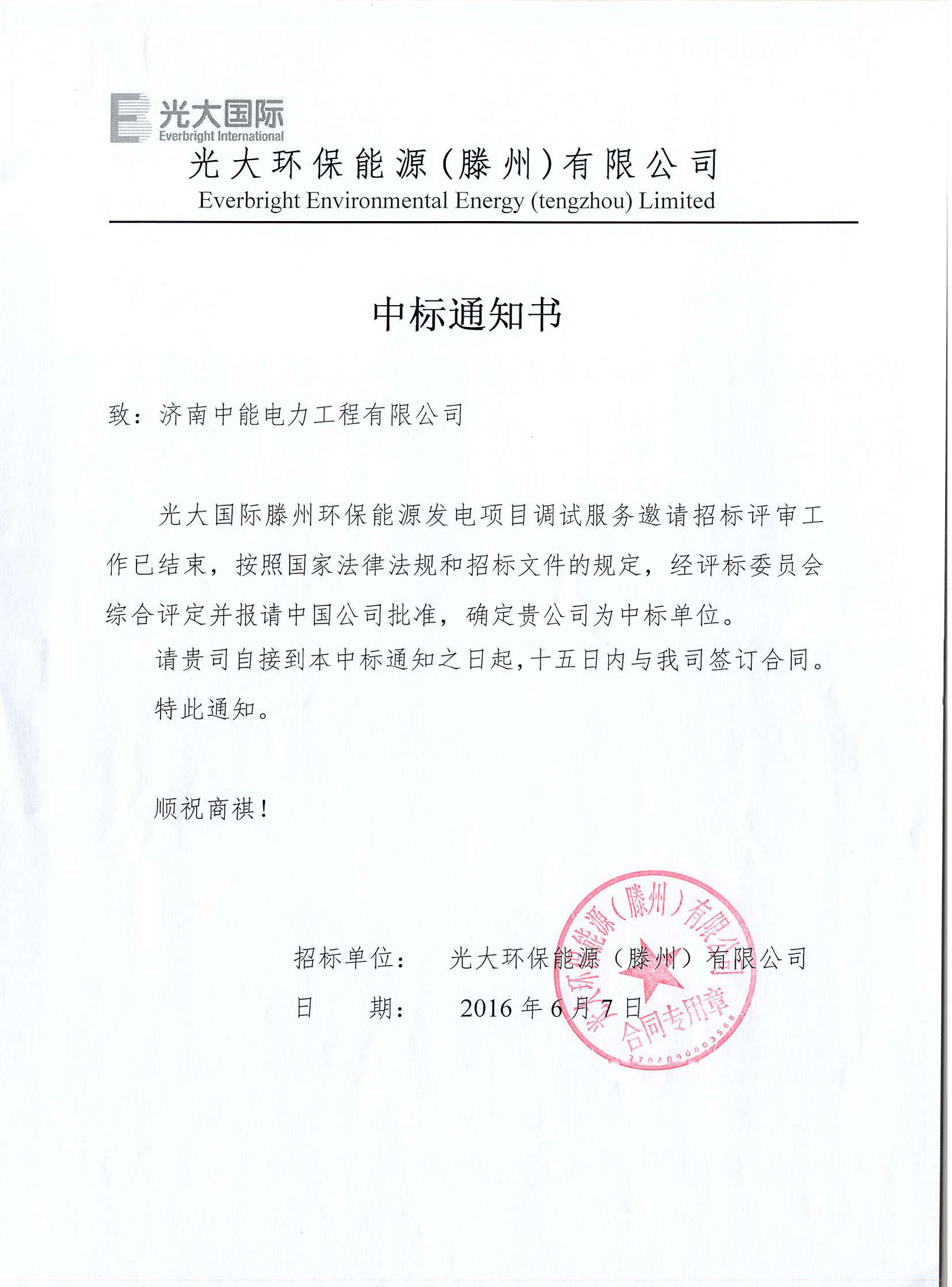公司同时签约光大滕州、光大平度生活垃圾焚烧发电调试项目