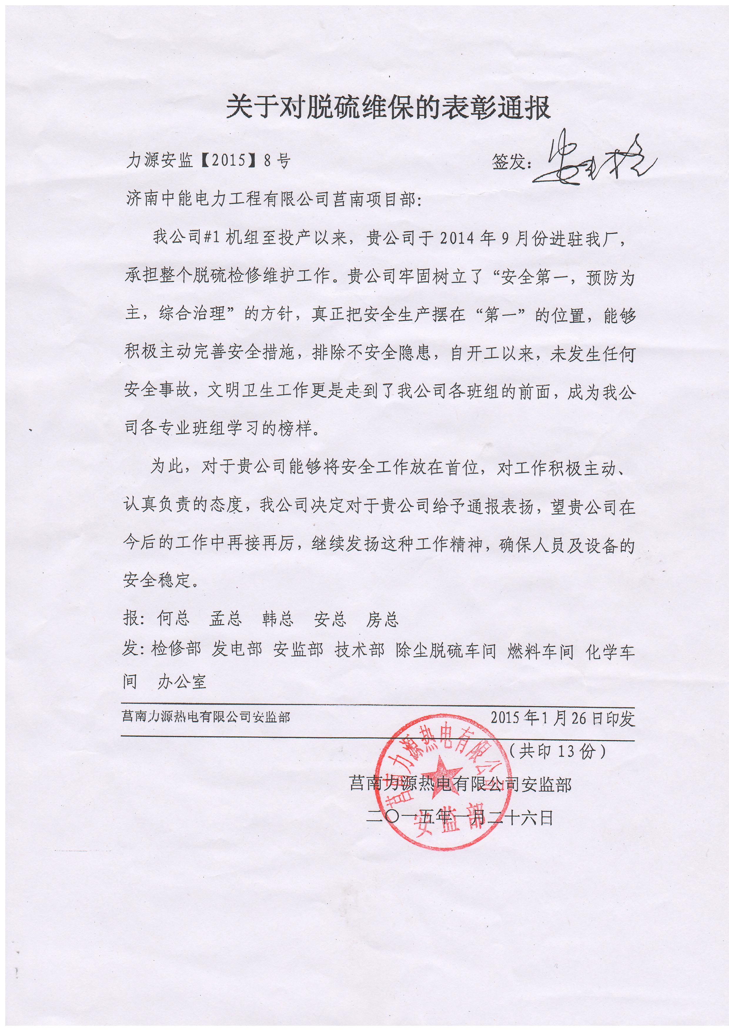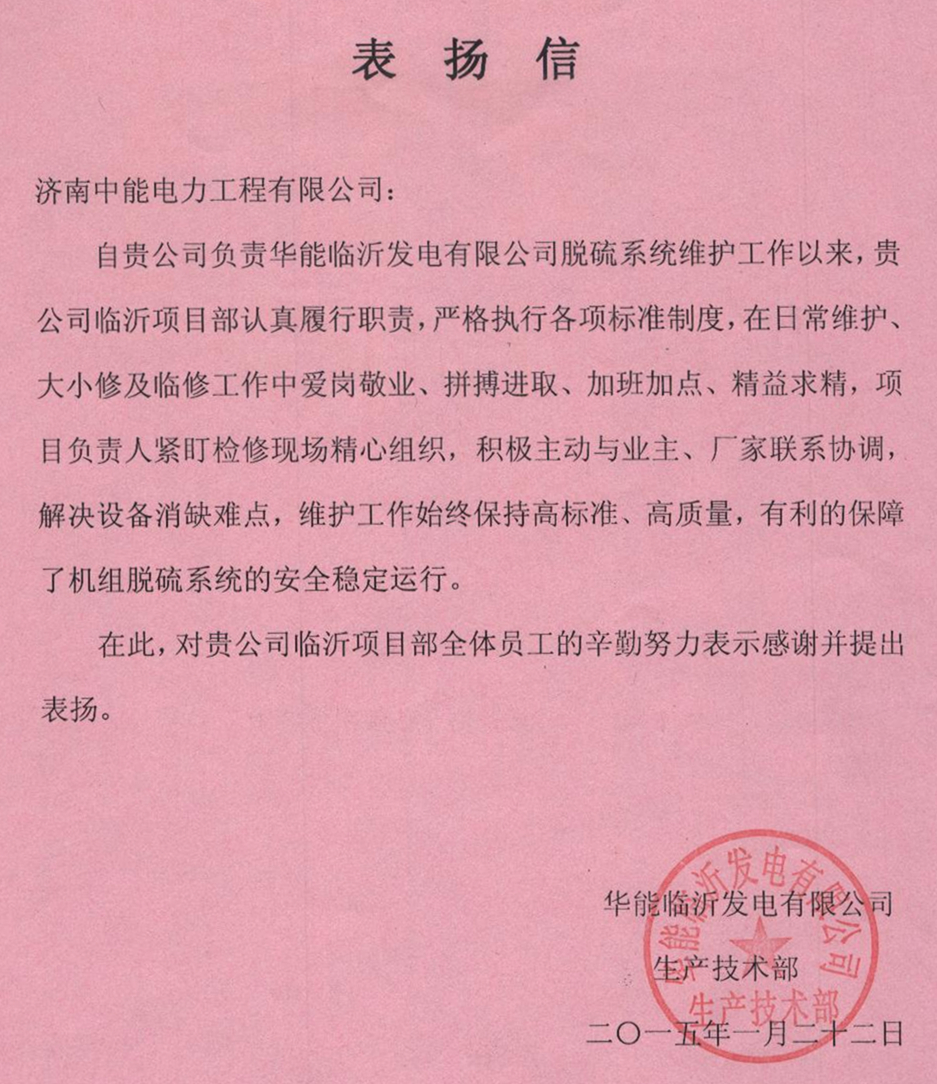 莒南运维项目再次受到业主表彰