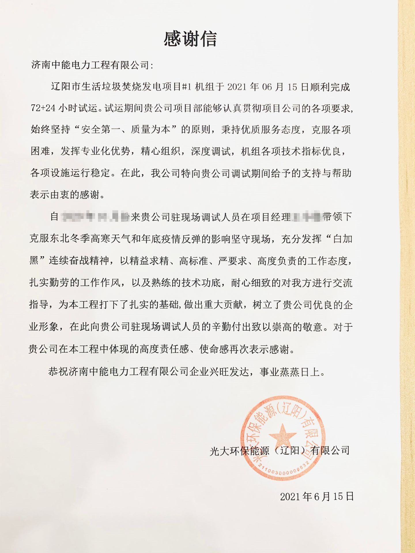 辽阳市生活垃圾焚烧发电项目72+24试运顺利完成