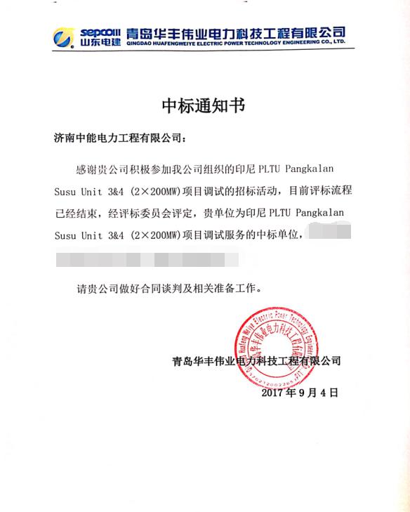 简讯:中能电力中标青岛华丰印尼PLTU Pangkalan Susu Unit 3&4(2*200MW)燃煤发电项目